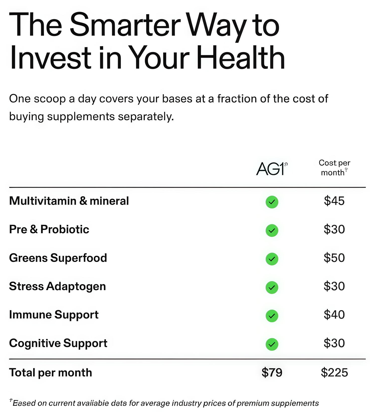Not exactly. AG1 Next Gen is a Daily Health Drink clinically shown to close common nutrient gaps and support gut health. It replaces your daily multivitamins, probiotics, prebiotics, adaptogens, and more – premium supplements you would typically buy for over $200 a month. We make it easy and affordable to get daily nutritional support for less than $3 a day when you subscribe.
