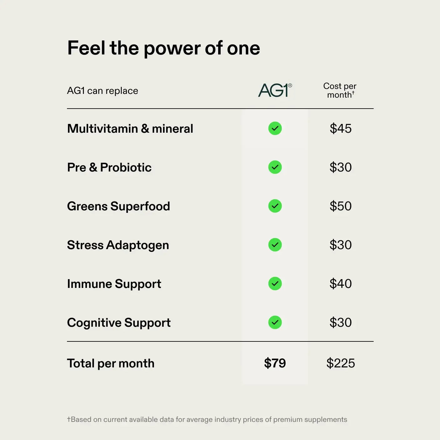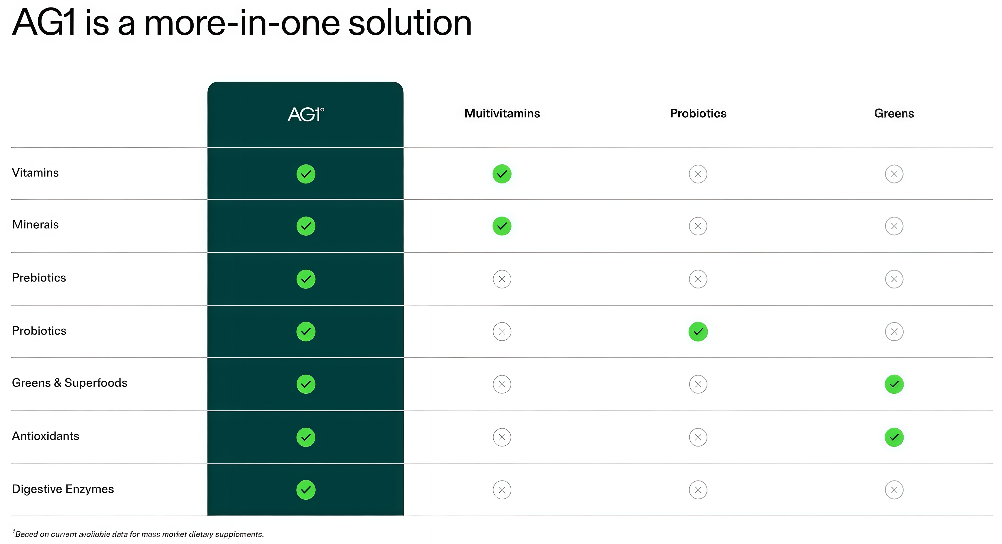 Every scoop of AG1 works to deliver comprehensive daily nutrition with ingredients that are carefully sourced for absorption, potency, and nutrient density.