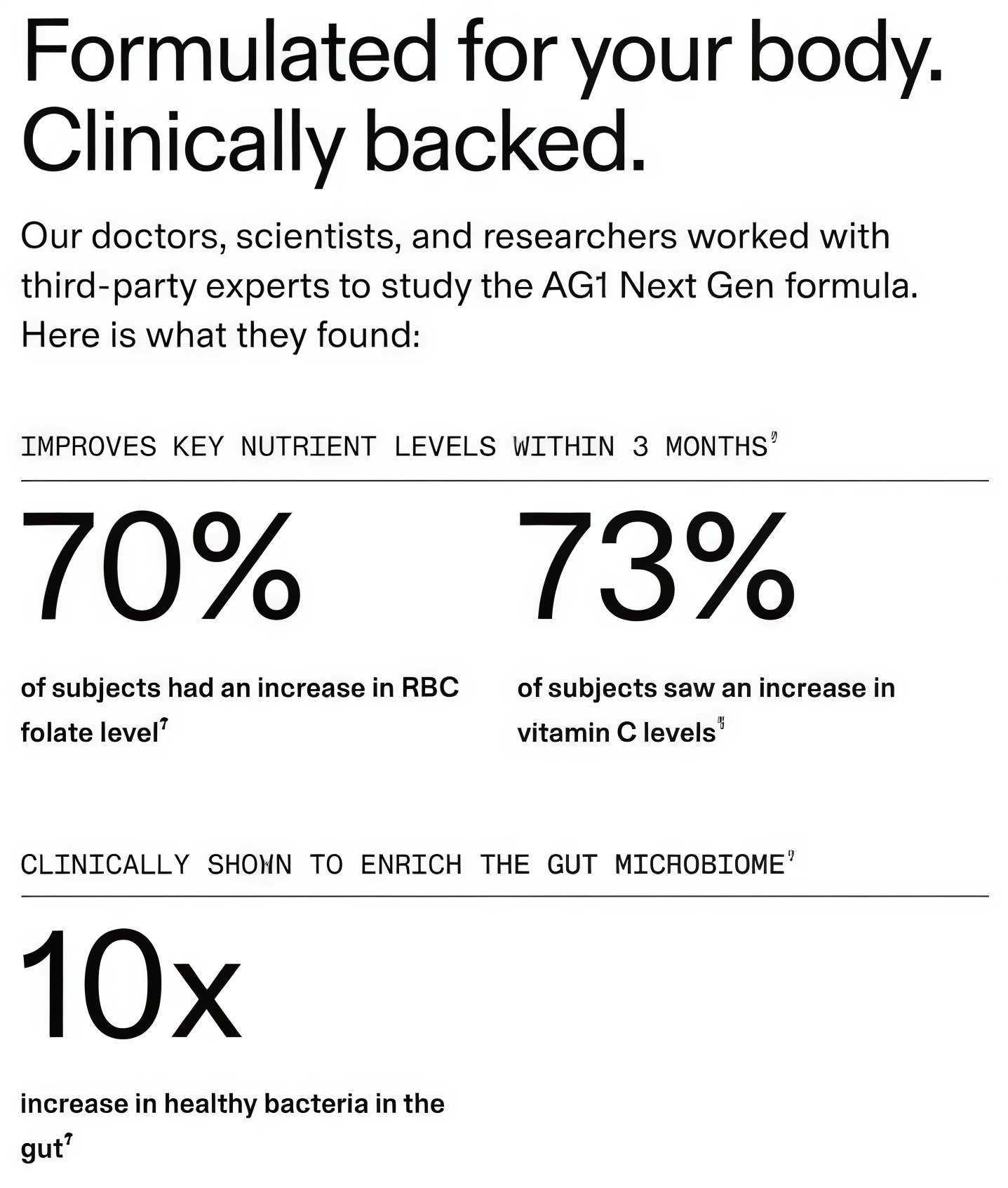 - Multiple gold-standard clinical trials that consistently show AG1 Next Gen helps fill nutrient gaps across a range of lifestyles and diets (1-4).